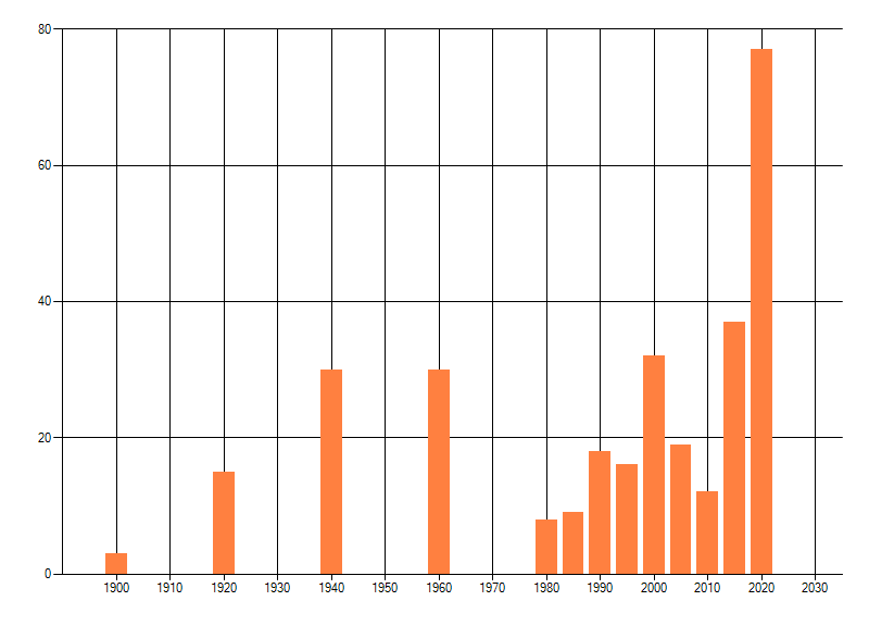 Het aantal atlasblokken (5x5 km) waarin de soort is gemeld binnen een periode van vijf jaar (vanaf 1980) of twintig jaar. Niet gecorrigeerd voor waarnemersinspanning en het aantal doorgegeven waarnemingen kan sterk variëren per periode, dus een trend in verspreiding kan hier niet direct uit worden afgelezen. Het opgegeven jaartal is het eerste jaar van de periode. Bron: gevalideerde waarnemingen uit de NDFF.