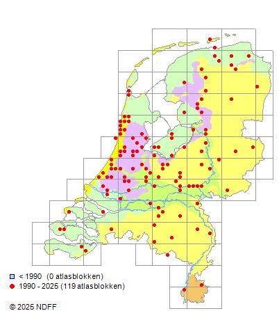 Het aantal atlasblokken (5x5 km) waarin de soort is gemeld binnen een periode van vijf jaar (vanaf 1980) of twintig jaar. Niet gecorrigeerd voor waarnemersinspanning en het aantal doorgegeven waarnemingen kan sterk variëren per periode, dus een trend in verspreiding kan hier niet direct uit worden afgelezen. Het opgegeven jaartal is het eerste jaar van de periode. Bron: gevalideerde waarnemingen uit de NDFF.