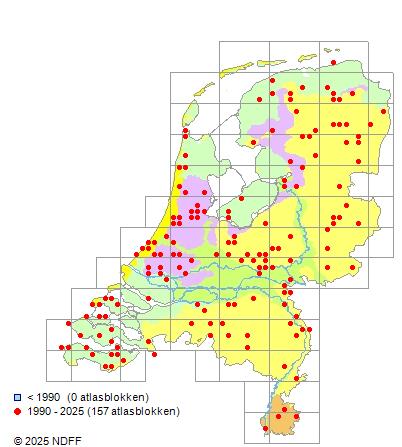Het aantal atlasblokken (5x5 km) waarin de soort is gemeld binnen een periode van vijf jaar (vanaf 1980) of twintig jaar. Niet gecorrigeerd voor waarnemersinspanning en het aantal doorgegeven waarnemingen kan sterk variëren per periode, dus een trend in verspreiding kan hier niet direct uit worden afgelezen. Het opgegeven jaartal is het eerste jaar van de periode. Bron: gevalideerde waarnemingen uit de NDFF.