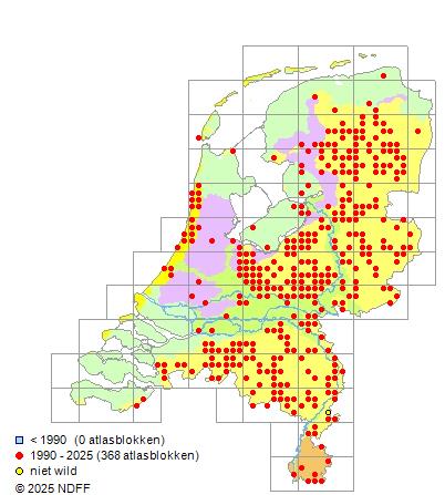Het aantal atlasblokken (5x5 km) waarin de soort is gemeld binnen een periode van vijf jaar (vanaf 1980) of twintig jaar. Niet gecorrigeerd voor waarnemersinspanning en het aantal doorgegeven waarnemingen kan sterk variëren per periode, dus een trend in verspreiding kan hier niet direct uit worden afgelezen. Het opgegeven jaartal is het eerste jaar van de periode. Bron: gevalideerde waarnemingen uit de NDFF.