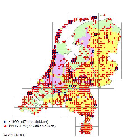 Het aantal atlasblokken (5x5 km) waarin de soort is gemeld binnen een periode van vijf jaar (vanaf 1980) of twintig jaar. Niet gecorrigeerd voor waarnemersinspanning en het aantal doorgegeven waarnemingen kan sterk variëren per periode, dus een trend in verspreiding kan hier niet direct uit worden afgelezen. Het opgegeven jaartal is het eerste jaar van de periode. Bron: gevalideerde waarnemingen uit de NDFF.