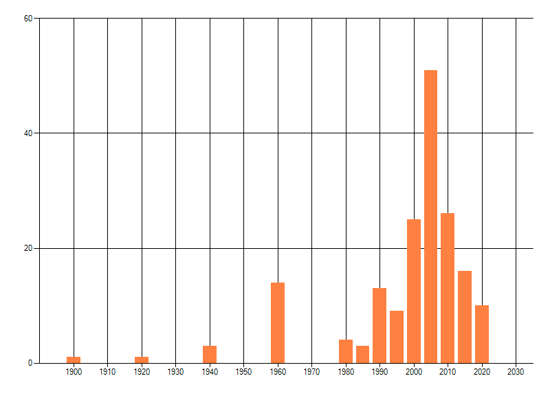 Het aantal atlasblokken (5x5 km) waarin de soort is gemeld binnen een periode van vijf jaar (vanaf 1980) of twintig jaar. Niet gecorrigeerd voor waarnemersinspanning en het aantal doorgegeven waarnemingen kan sterk variëren per periode, dus een trend in verspreiding kan hier niet direct uit worden afgelezen. Het opgegeven jaartal is het eerste jaar van de periode. Bron: gevalideerde waarnemingen uit de NDFF.