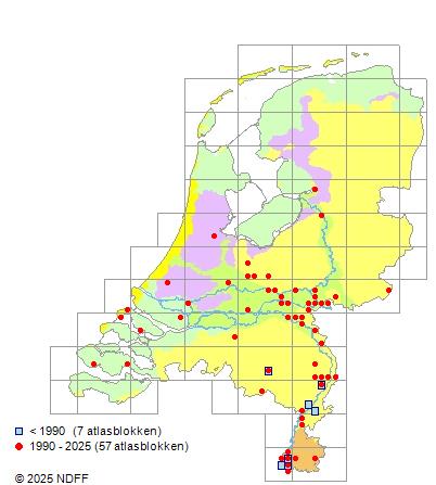 Het aantal atlasblokken (5x5 km) waarin de soort is gemeld binnen een periode van vijf jaar (vanaf 1980) of twintig jaar. Niet gecorrigeerd voor waarnemersinspanning en het aantal doorgegeven waarnemingen kan sterk variëren per periode, dus een trend in verspreiding kan hier niet direct uit worden afgelezen. Het opgegeven jaartal is het eerste jaar van de periode. Bron: gevalideerde waarnemingen uit de NDFF.