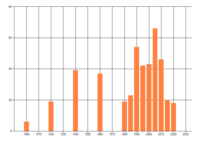 Het aantal atlasblokken (5x5 km) waarin de soort is gemeld binnen een periode van vijf jaar (vanaf 1980) of twintig jaar. Niet gecorrigeerd voor waarnemersinspanning en het aantal doorgegeven waarnemingen kan sterk variëren per periode, dus een trend in verspreiding kan hier niet direct uit worden afgelezen. Het opgegeven jaartal is het eerste jaar van de periode. Bron: gevalideerde waarnemingen uit de NDFF.