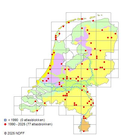 Het aantal atlasblokken (5x5 km) waarin de soort is gemeld binnen een periode van vijf jaar (vanaf 1980) of twintig jaar. Niet gecorrigeerd voor waarnemersinspanning en het aantal doorgegeven waarnemingen kan sterk variëren per periode, dus een trend in verspreiding kan hier niet direct uit worden afgelezen. Het opgegeven jaartal is het eerste jaar van de periode. Bron: gevalideerde waarnemingen uit de NDFF.