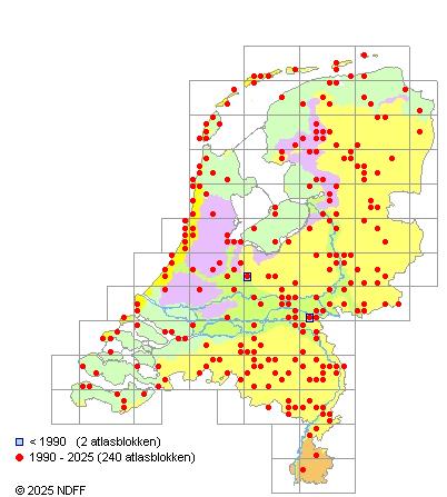 Het aantal atlasblokken (5x5 km) waarin de soort is gemeld binnen een periode van vijf jaar (vanaf 1980) of twintig jaar. Niet gecorrigeerd voor waarnemersinspanning en het aantal doorgegeven waarnemingen kan sterk variëren per periode, dus een trend in verspreiding kan hier niet direct uit worden afgelezen. Het opgegeven jaartal is het eerste jaar van de periode. Bron: gevalideerde waarnemingen uit de NDFF.