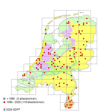 Het aantal atlasblokken (5x5 km) waarin de soort is gemeld binnen een periode van vijf jaar (vanaf 1980) of twintig jaar. Niet gecorrigeerd voor waarnemersinspanning en het aantal doorgegeven waarnemingen kan sterk variëren per periode, dus een trend in verspreiding kan hier niet direct uit worden afgelezen. Het opgegeven jaartal is het eerste jaar van de periode. Bron: gevalideerde waarnemingen uit de NDFF.