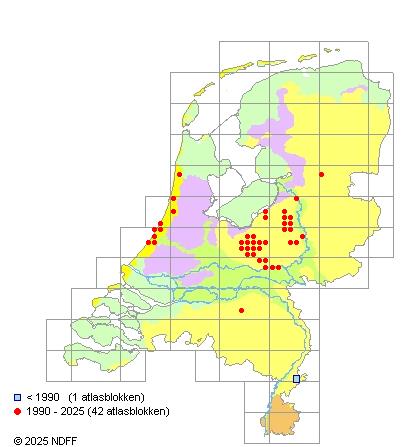 Het aantal atlasblokken (5x5 km) waarin de soort is gemeld binnen een periode van vijf jaar (vanaf 1980) of twintig jaar. Niet gecorrigeerd voor waarnemersinspanning en het aantal doorgegeven waarnemingen kan sterk variëren per periode, dus een trend in verspreiding kan hier niet direct uit worden afgelezen. Het opgegeven jaartal is het eerste jaar van de periode. Bron: gevalideerde waarnemingen uit de NDFF.