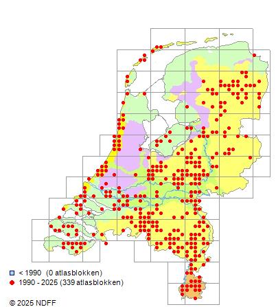 Het aantal atlasblokken (5x5 km) waarin de soort is gemeld binnen een periode van vijf jaar (vanaf 1980) of twintig jaar. Niet gecorrigeerd voor waarnemersinspanning en het aantal doorgegeven waarnemingen kan sterk variëren per periode, dus een trend in verspreiding kan hier niet direct uit worden afgelezen. Het opgegeven jaartal is het eerste jaar van de periode. Bron: gevalideerde waarnemingen uit de NDFF.