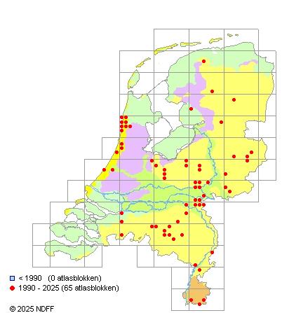 Het aantal atlasblokken (5x5 km) waarin de soort is gemeld binnen een periode van vijf jaar (vanaf 1980) of twintig jaar. Niet gecorrigeerd voor waarnemersinspanning en het aantal doorgegeven waarnemingen kan sterk variëren per periode, dus een trend in verspreiding kan hier niet direct uit worden afgelezen. Het opgegeven jaartal is het eerste jaar van de periode. Bron: gevalideerde waarnemingen uit de NDFF.