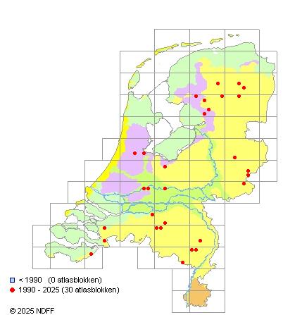 Het aantal atlasblokken (5x5 km) waarin de soort is gemeld binnen een periode van vijf jaar (vanaf 1980) of twintig jaar. Niet gecorrigeerd voor waarnemersinspanning en het aantal doorgegeven waarnemingen kan sterk variëren per periode, dus een trend in verspreiding kan hier niet direct uit worden afgelezen. Het opgegeven jaartal is het eerste jaar van de periode. Bron: gevalideerde waarnemingen uit de NDFF.