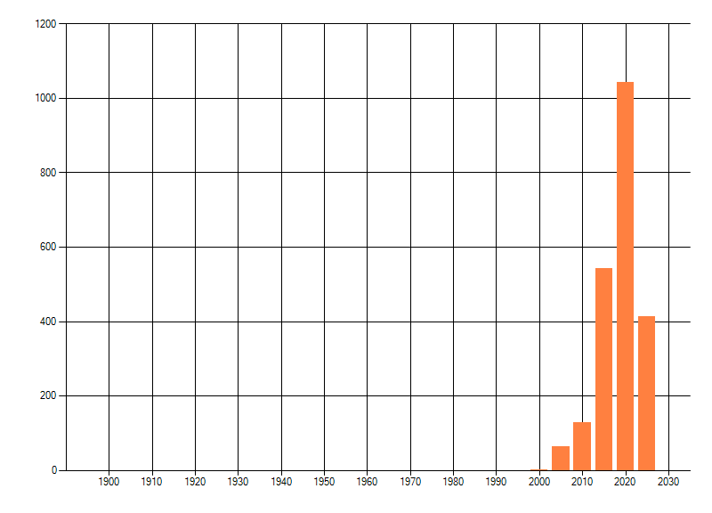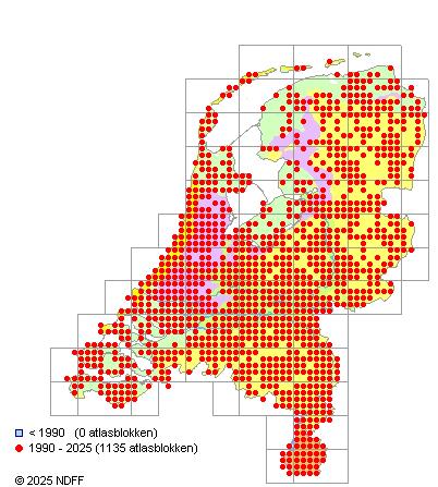 Het aantal atlasblokken (5x5 km) waarin de soort is gemeld binnen een periode van vijf jaar (vanaf 1980) of twintig jaar. Niet gecorrigeerd voor waarnemersinspanning en het aantal doorgegeven waarnemingen kan sterk variëren per periode, dus een trend in verspreiding kan hier niet direct uit worden afgelezen. Het opgegeven jaartal is het eerste jaar van de periode. Bron: gevalideerde waarnemingen uit de NDFF.