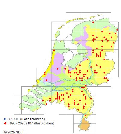 Het aantal atlasblokken (5x5 km) waarin de soort is gemeld binnen een periode van vijf jaar (vanaf 1980) of twintig jaar. Niet gecorrigeerd voor waarnemersinspanning en het aantal doorgegeven waarnemingen kan sterk variëren per periode, dus een trend in verspreiding kan hier niet direct uit worden afgelezen. Het opgegeven jaartal is het eerste jaar van de periode. Bron: gevalideerde waarnemingen uit de NDFF.