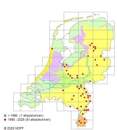 Het aantal atlasblokken (5x5 km) waarin de soort is gemeld binnen een periode van vijf jaar (vanaf 1980) of twintig jaar. Niet gecorrigeerd voor waarnemersinspanning en het aantal doorgegeven waarnemingen kan sterk variëren per periode, dus een trend in verspreiding kan hier niet direct uit worden afgelezen. Het opgegeven jaartal is het eerste jaar van de periode. Bron: gevalideerde waarnemingen uit de NDFF.