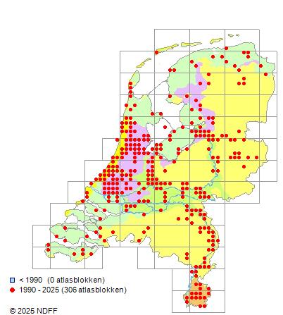 Het aantal atlasblokken (5x5 km) waarin de soort is gemeld binnen een periode van vijf jaar (vanaf 1980) of twintig jaar. Niet gecorrigeerd voor waarnemersinspanning en het aantal doorgegeven waarnemingen kan sterk variëren per periode, dus een trend in verspreiding kan hier niet direct uit worden afgelezen. Het opgegeven jaartal is het eerste jaar van de periode. Bron: gevalideerde waarnemingen uit de NDFF.
