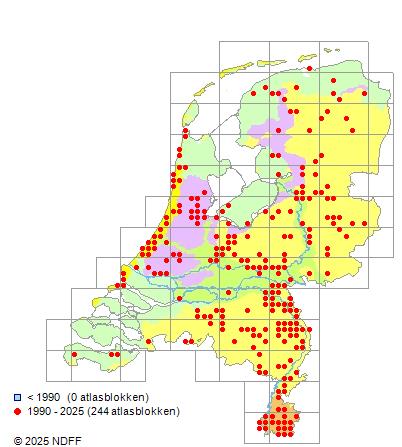 Het aantal atlasblokken (5x5 km) waarin de soort is gemeld binnen een periode van vijf jaar (vanaf 1980) of twintig jaar. Niet gecorrigeerd voor waarnemersinspanning en het aantal doorgegeven waarnemingen kan sterk variëren per periode, dus een trend in verspreiding kan hier niet direct uit worden afgelezen. Het opgegeven jaartal is het eerste jaar van de periode. Bron: gevalideerde waarnemingen uit de NDFF.