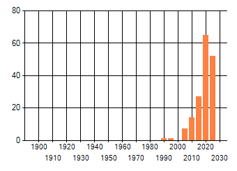 Het aantal atlasblokken (5x5 km) waarin de soort is gemeld binnen een periode van vijf jaar (vanaf 1980) of twintig jaar. Niet gecorrigeerd voor waarnemersinspanning en het aantal doorgegeven waarnemingen kan sterk variëren per periode, dus een trend in verspreiding kan hier niet direct uit worden afgelezen. Het opgegeven jaartal is het eerste jaar van de periode. Bron: gevalideerde waarnemingen uit de NDFF.