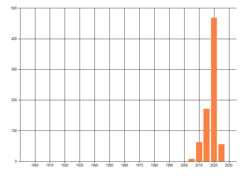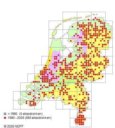 Het aantal atlasblokken (5x5 km) waarin de soort is gemeld binnen een periode van vijf jaar (vanaf 1980) of twintig jaar. Niet gecorrigeerd voor waarnemersinspanning en het aantal doorgegeven waarnemingen kan sterk variëren per periode, dus een trend in verspreiding kan hier niet direct uit worden afgelezen. Het opgegeven jaartal is het eerste jaar van de periode. Bron: gevalideerde waarnemingen uit de NDFF.
