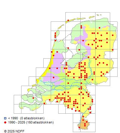 Het aantal atlasblokken (5x5 km) waarin de soort is gemeld binnen een periode van vijf jaar (vanaf 1980) of twintig jaar. Niet gecorrigeerd voor waarnemersinspanning en het aantal doorgegeven waarnemingen kan sterk variëren per periode, dus een trend in verspreiding kan hier niet direct uit worden afgelezen. Het opgegeven jaartal is het eerste jaar van de periode. Bron: gevalideerde waarnemingen uit de NDFF.