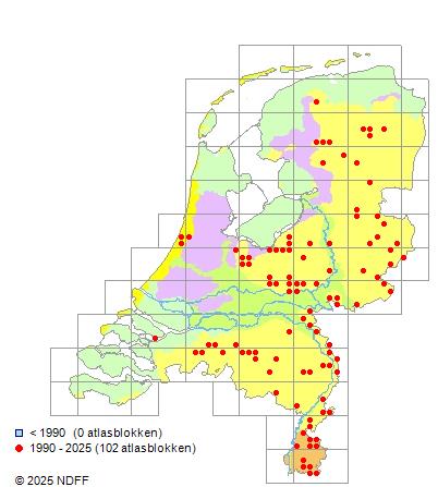 Het aantal atlasblokken (5x5 km) waarin de soort is gemeld binnen een periode van vijf jaar (vanaf 1980) of twintig jaar. Niet gecorrigeerd voor waarnemersinspanning en het aantal doorgegeven waarnemingen kan sterk variëren per periode, dus een trend in verspreiding kan hier niet direct uit worden afgelezen. Het opgegeven jaartal is het eerste jaar van de periode. Bron: gevalideerde waarnemingen uit de NDFF.