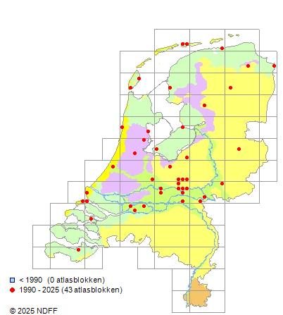Het aantal atlasblokken (5x5 km) waarin de soort is gemeld binnen een periode van vijf jaar (vanaf 1980) of twintig jaar. Niet gecorrigeerd voor waarnemersinspanning en het aantal doorgegeven waarnemingen kan sterk variëren per periode, dus een trend in verspreiding kan hier niet direct uit worden afgelezen. Het opgegeven jaartal is het eerste jaar van de periode. Bron: gevalideerde waarnemingen uit de NDFF.