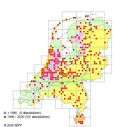 Het aantal atlasblokken (5x5 km) waarin de soort is gemeld binnen een periode van vijf jaar (vanaf 1980) of twintig jaar. Niet gecorrigeerd voor waarnemersinspanning en het aantal doorgegeven waarnemingen kan sterk variëren per periode, dus een trend in verspreiding kan hier niet direct uit worden afgelezen. Het opgegeven jaartal is het eerste jaar van de periode. Bron: gevalideerde waarnemingen uit de NDFF.
