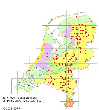 Het aantal atlasblokken (5x5 km) waarin de soort is gemeld binnen een periode van vijf jaar (vanaf 1980) of twintig jaar. Niet gecorrigeerd voor waarnemersinspanning en het aantal doorgegeven waarnemingen kan sterk variëren per periode, dus een trend in verspreiding kan hier niet direct uit worden afgelezen. Het opgegeven jaartal is het eerste jaar van de periode. Bron: gevalideerde waarnemingen uit de NDFF.