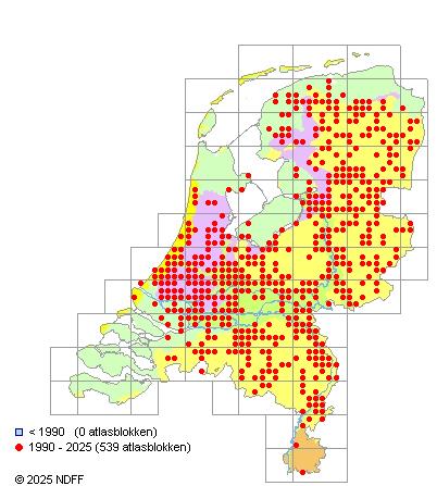 Het aantal atlasblokken (5x5 km) waarin de soort is gemeld binnen een periode van vijf jaar (vanaf 1980) of twintig jaar. Niet gecorrigeerd voor waarnemersinspanning en het aantal doorgegeven waarnemingen kan sterk variëren per periode, dus een trend in verspreiding kan hier niet direct uit worden afgelezen. Het opgegeven jaartal is het eerste jaar van de periode. Bron: gevalideerde waarnemingen uit de NDFF.