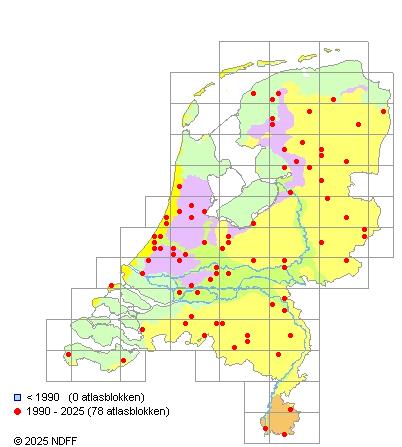Het aantal atlasblokken (5x5 km) waarin de soort is gemeld binnen een periode van vijf jaar (vanaf 1980) of twintig jaar. Niet gecorrigeerd voor waarnemersinspanning en het aantal doorgegeven waarnemingen kan sterk variëren per periode, dus een trend in verspreiding kan hier niet direct uit worden afgelezen. Het opgegeven jaartal is het eerste jaar van de periode. Bron: gevalideerde waarnemingen uit de NDFF.