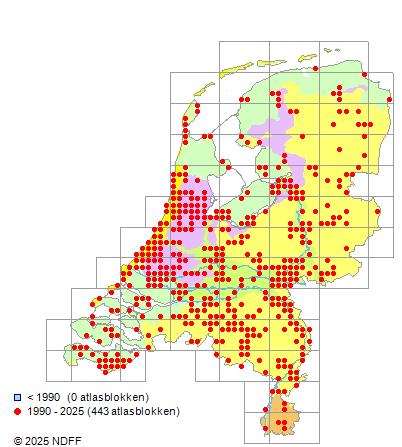 Het aantal atlasblokken (5x5 km) waarin de soort is gemeld binnen een periode van vijf jaar (vanaf 1980) of twintig jaar. Niet gecorrigeerd voor waarnemersinspanning en het aantal doorgegeven waarnemingen kan sterk variëren per periode, dus een trend in verspreiding kan hier niet direct uit worden afgelezen. Het opgegeven jaartal is het eerste jaar van de periode. Bron: gevalideerde waarnemingen uit de NDFF.