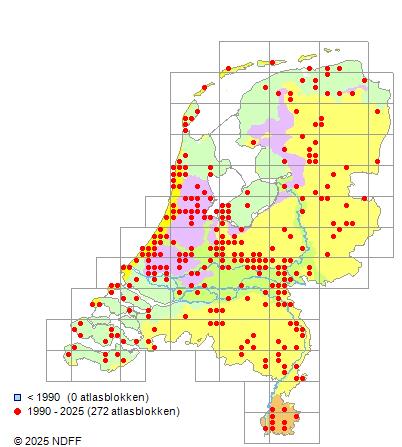 Het aantal atlasblokken (5x5 km) waarin de soort is gemeld binnen een periode van vijf jaar (vanaf 1980) of twintig jaar. Niet gecorrigeerd voor waarnemersinspanning en het aantal doorgegeven waarnemingen kan sterk variëren per periode, dus een trend in verspreiding kan hier niet direct uit worden afgelezen. Het opgegeven jaartal is het eerste jaar van de periode. Bron: gevalideerde waarnemingen uit de NDFF.