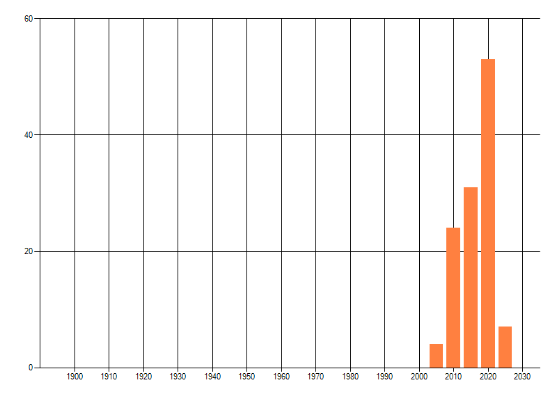 Het aantal atlasblokken (5x5 km) waarin de soort is gemeld binnen een periode van vijf jaar (vanaf 1980) of twintig jaar. Niet gecorrigeerd voor waarnemersinspanning en het aantal doorgegeven waarnemingen kan sterk variëren per periode, dus een trend in verspreiding kan hier niet direct uit worden afgelezen. Het opgegeven jaartal is het eerste jaar van de periode. Bron: gevalideerde waarnemingen uit de NDFF.
