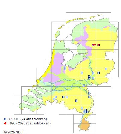 Het aantal atlasblokken (5x5 km) waarin de soort is gemeld binnen een periode van vijf jaar (vanaf 1980) of twintig jaar. Niet gecorrigeerd voor waarnemersinspanning en het aantal doorgegeven waarnemingen kan sterk variëren per periode, dus een trend in verspreiding kan hier niet direct uit worden afgelezen. Het opgegeven jaartal is het eerste jaar van de periode. Bron: gevalideerde waarnemingen uit de NDFF.