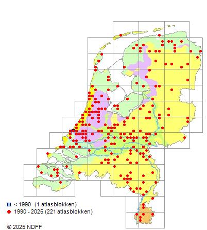 Het aantal atlasblokken (5x5 km) waarin de soort is gemeld binnen een periode van vijf jaar (vanaf 1980) of twintig jaar. Niet gecorrigeerd voor waarnemersinspanning en het aantal doorgegeven waarnemingen kan sterk variëren per periode, dus een trend in verspreiding kan hier niet direct uit worden afgelezen. Het opgegeven jaartal is het eerste jaar van de periode. Bron: gevalideerde waarnemingen uit de NDFF.