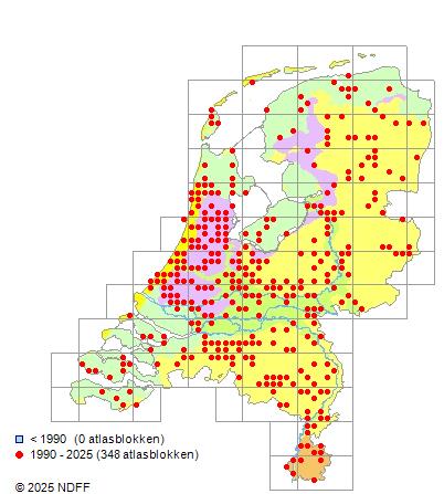 Het aantal atlasblokken (5x5 km) waarin de soort is gemeld binnen een periode van vijf jaar (vanaf 1980) of twintig jaar. Niet gecorrigeerd voor waarnemersinspanning en het aantal doorgegeven waarnemingen kan sterk variëren per periode, dus een trend in verspreiding kan hier niet direct uit worden afgelezen. Het opgegeven jaartal is het eerste jaar van de periode. Bron: gevalideerde waarnemingen uit de NDFF.