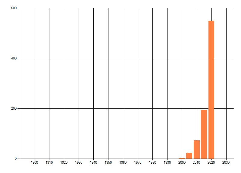 Het aantal atlasblokken (5x5 km) waarin de soort is gemeld binnen een periode van vijf jaar (vanaf 1980) of twintig jaar. Niet gecorrigeerd voor waarnemersinspanning en het aantal doorgegeven waarnemingen kan sterk variëren per periode, dus een trend in verspreiding kan hier niet direct uit worden afgelezen. Het opgegeven jaartal is het eerste jaar van de periode. Bron: gevalideerde waarnemingen uit de NDFF.
