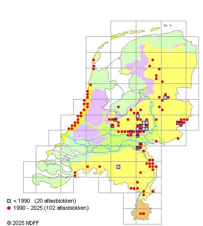 Het aantal atlasblokken (5x5 km) waarin de soort is gemeld binnen een periode van vijf jaar (vanaf 1980) of twintig jaar. Niet gecorrigeerd voor waarnemersinspanning en het aantal doorgegeven waarnemingen kan sterk variëren per periode, dus een trend in verspreiding kan hier niet direct uit worden afgelezen. Het opgegeven jaartal is het eerste jaar van de periode. Bron: gevalideerde waarnemingen uit de NDFF.