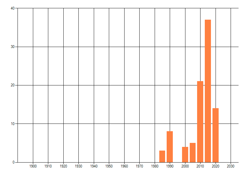 Het aantal atlasblokken (5x5 km) waarin de soort is gemeld binnen een periode van vijf jaar (vanaf 1980) of twintig jaar. Niet gecorrigeerd voor waarnemersinspanning en het aantal doorgegeven waarnemingen kan sterk variëren per periode, dus een trend in verspreiding kan hier niet direct uit worden afgelezen. Het opgegeven jaartal is het eerste jaar van de periode. Bron: gevalideerde waarnemingen uit de NDFF.
