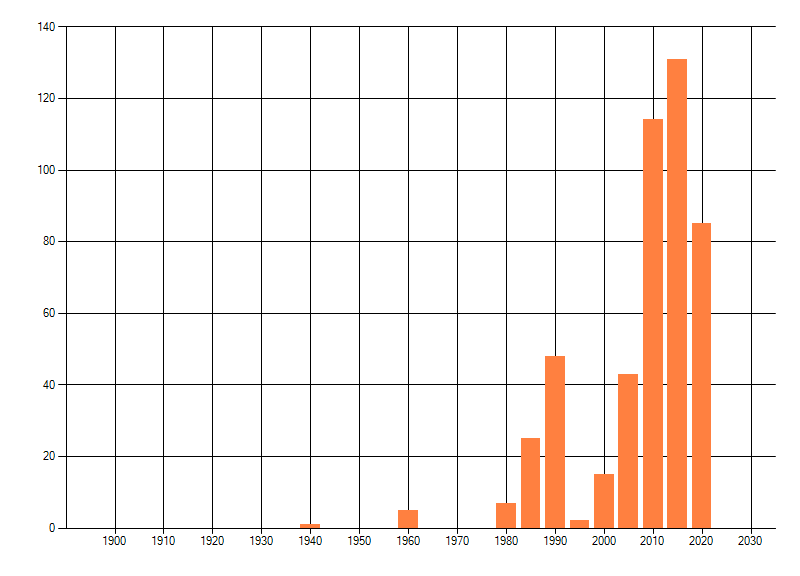 Het aantal atlasblokken (5x5 km) waarin de soort is gemeld binnen een periode van vijf jaar (vanaf 1980) of twintig jaar. Niet gecorrigeerd voor waarnemersinspanning en het aantal doorgegeven waarnemingen kan sterk variëren per periode, dus een trend in verspreiding kan hier niet direct uit worden afgelezen. Het opgegeven jaartal is het eerste jaar van de periode. Bron: gevalideerde waarnemingen uit de NDFF.