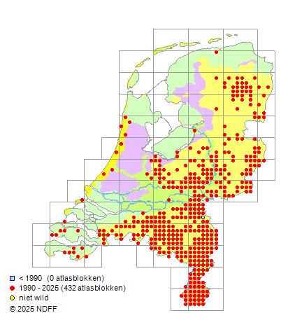 Het aantal atlasblokken (5x5 km) waarin de soort is gemeld binnen een periode van vijf jaar (vanaf 1980) of twintig jaar. Niet gecorrigeerd voor waarnemersinspanning en het aantal doorgegeven waarnemingen kan sterk variëren per periode, dus een trend in verspreiding kan hier niet direct uit worden afgelezen. Het opgegeven jaartal is het eerste jaar van de periode. Bron: gevalideerde waarnemingen uit de NDFF.
