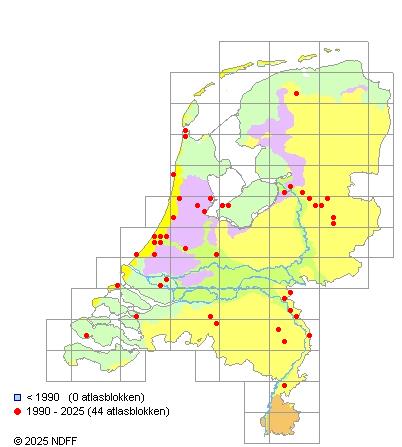 Het aantal atlasblokken (5x5 km) waarin de soort is gemeld binnen een periode van vijf jaar (vanaf 1980) of twintig jaar. Niet gecorrigeerd voor waarnemersinspanning en het aantal doorgegeven waarnemingen kan sterk variëren per periode, dus een trend in verspreiding kan hier niet direct uit worden afgelezen. Het opgegeven jaartal is het eerste jaar van de periode. Bron: gevalideerde waarnemingen uit de NDFF.