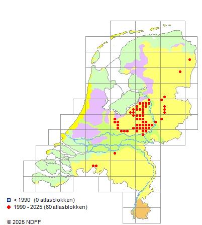 Het aantal atlasblokken (5x5 km) waarin de soort is gemeld binnen een periode van vijf jaar (vanaf 1980) of twintig jaar. Niet gecorrigeerd voor waarnemersinspanning en het aantal doorgegeven waarnemingen kan sterk variëren per periode, dus een trend in verspreiding kan hier niet direct uit worden afgelezen. Het opgegeven jaartal is het eerste jaar van de periode. Bron: gevalideerde waarnemingen uit de NDFF.