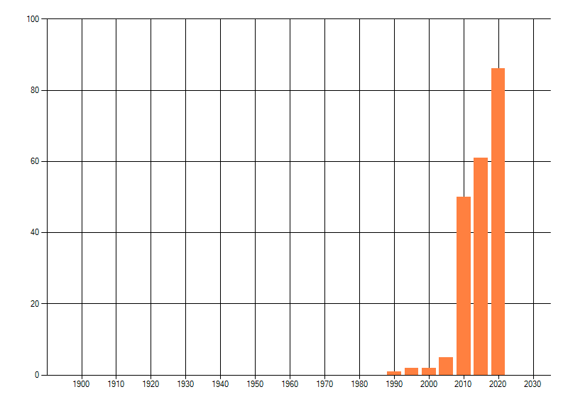 Het aantal atlasblokken (5x5 km) waarin de soort is gemeld binnen een periode van vijf jaar (vanaf 1980) of twintig jaar. Niet gecorrigeerd voor waarnemersinspanning en het aantal doorgegeven waarnemingen kan sterk variëren per periode, dus een trend in verspreiding kan hier niet direct uit worden afgelezen. Het opgegeven jaartal is het eerste jaar van de periode. Bron: gevalideerde waarnemingen uit de NDFF.