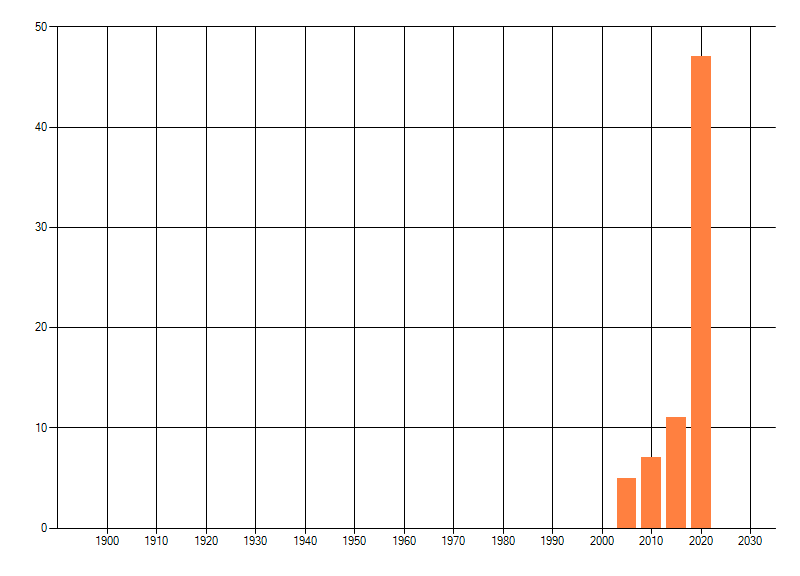 Het aantal atlasblokken (5x5 km) waarin de soort is gemeld binnen een periode van vijf jaar (vanaf 1980) of twintig jaar. Niet gecorrigeerd voor waarnemersinspanning en het aantal doorgegeven waarnemingen kan sterk variëren per periode, dus een trend in verspreiding kan hier niet direct uit worden afgelezen. Het opgegeven jaartal is het eerste jaar van de periode. Bron: gevalideerde waarnemingen uit de NDFF.