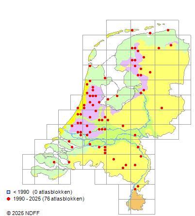 Het aantal atlasblokken (5x5 km) waarin de soort is gemeld binnen een periode van vijf jaar (vanaf 1980) of twintig jaar. Niet gecorrigeerd voor waarnemersinspanning en het aantal doorgegeven waarnemingen kan sterk variëren per periode, dus een trend in verspreiding kan hier niet direct uit worden afgelezen. Het opgegeven jaartal is het eerste jaar van de periode. Bron: gevalideerde waarnemingen uit de NDFF.