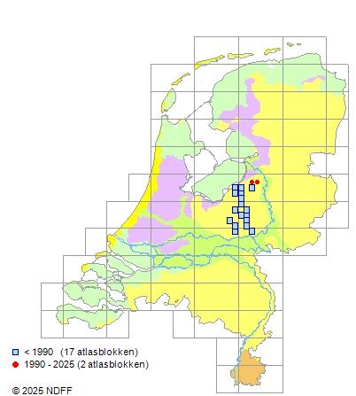 Het aantal atlasblokken (5x5 km) waarin de soort is gemeld binnen een periode van vijf jaar (vanaf 1980) of twintig jaar. Niet gecorrigeerd voor waarnemersinspanning en het aantal doorgegeven waarnemingen kan sterk variëren per periode, dus een trend in verspreiding kan hier niet direct uit worden afgelezen. Het opgegeven jaartal is het eerste jaar van de periode. Bron: gevalideerde waarnemingen uit de NDFF.