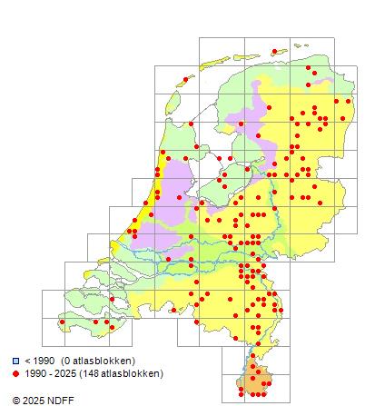 Het aantal atlasblokken (5x5 km) waarin de soort is gemeld binnen een periode van vijf jaar (vanaf 1980) of twintig jaar. Niet gecorrigeerd voor waarnemersinspanning en het aantal doorgegeven waarnemingen kan sterk variëren per periode, dus een trend in verspreiding kan hier niet direct uit worden afgelezen. Het opgegeven jaartal is het eerste jaar van de periode. Bron: gevalideerde waarnemingen uit de NDFF.