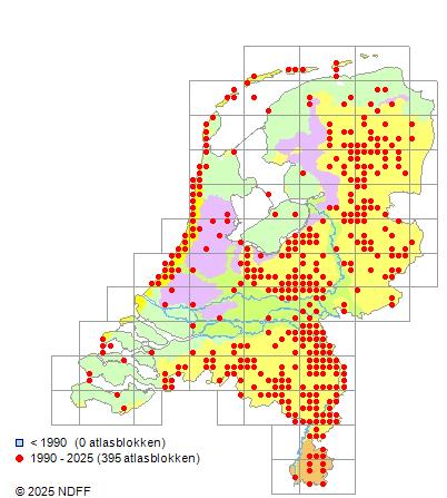 Het aantal atlasblokken (5x5 km) waarin de soort is gemeld binnen een periode van vijf jaar (vanaf 1980) of twintig jaar. Niet gecorrigeerd voor waarnemersinspanning en het aantal doorgegeven waarnemingen kan sterk variëren per periode, dus een trend in verspreiding kan hier niet direct uit worden afgelezen. Het opgegeven jaartal is het eerste jaar van de periode. Bron: gevalideerde waarnemingen uit de NDFF.