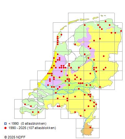 Het aantal atlasblokken (5x5 km) waarin de soort is gemeld binnen een periode van vijf jaar (vanaf 1980) of twintig jaar. Niet gecorrigeerd voor waarnemersinspanning en het aantal doorgegeven waarnemingen kan sterk variëren per periode, dus een trend in verspreiding kan hier niet direct uit worden afgelezen. Het opgegeven jaartal is het eerste jaar van de periode. Bron: gevalideerde waarnemingen uit de NDFF.