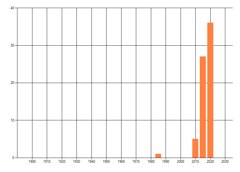 Het aantal atlasblokken (5x5 km) waarin de soort is gemeld binnen een periode van vijf jaar (vanaf 1980) of twintig jaar. Niet gecorrigeerd voor waarnemersinspanning en het aantal doorgegeven waarnemingen kan sterk variëren per periode, dus een trend in verspreiding kan hier niet direct uit worden afgelezen. Het opgegeven jaartal is het eerste jaar van de periode. Bron: gevalideerde waarnemingen uit de NDFF.